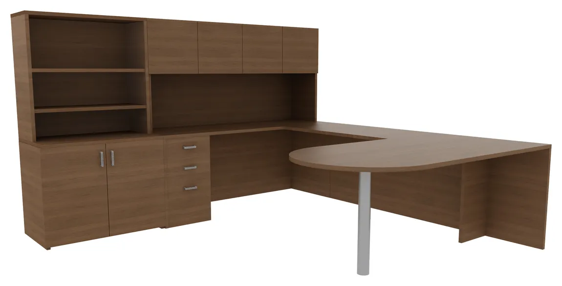 Desk with BookcaseThis U shaped computer desk is available in multiple finishes, Valley Grey shown, and features an overhead storage compartment protected by matching-finish doors. An additional combination cabinet and bookcase allows for even more to be kept within arm's reach. Quality backed by a 10-year manufacturer's warranty. This item is currently not available to purchase. Check out these related items: