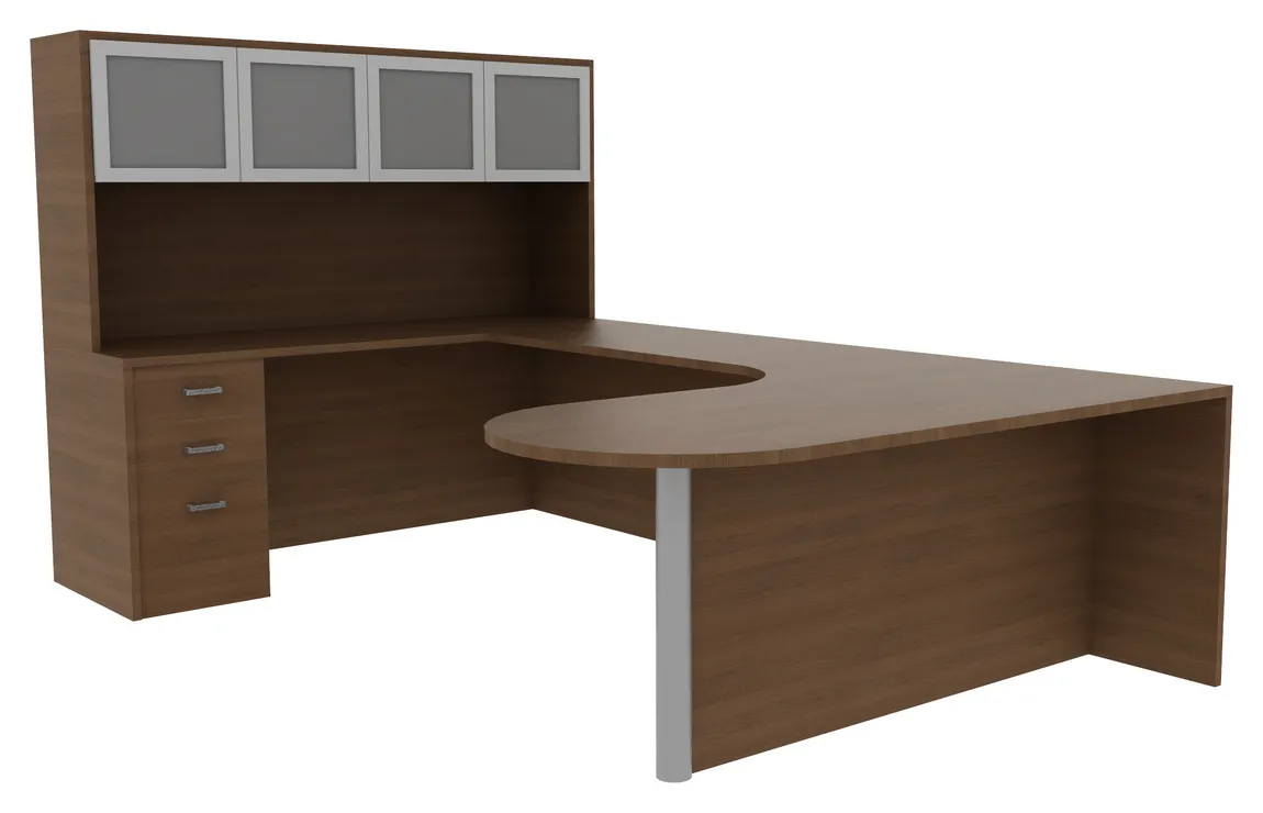 Desk with HutchThis U shaped desk with hutch is available in multiple finishes, Valley Gray shown, and features a set of translucent glass doors for overhead storage. The front of the desk has a peninsula design, offering better access from all directions. Quality backed by a 10-year manufacturer's warranty. This item is currently not available to purchase. Check out these related items: