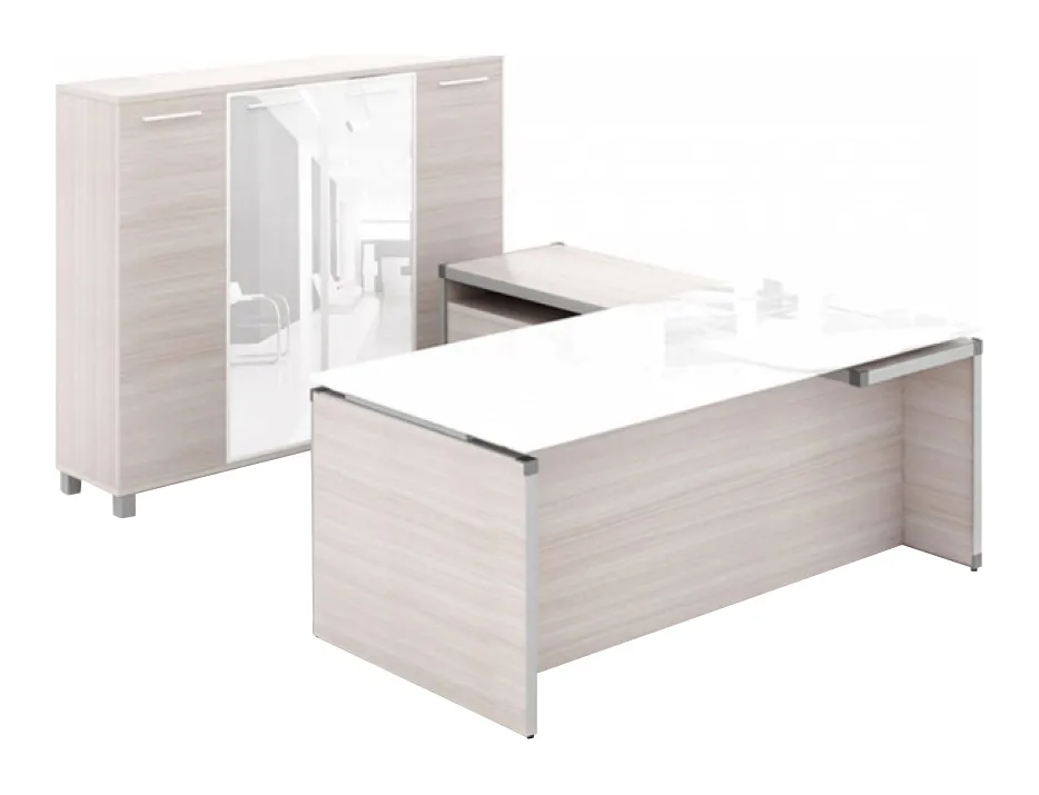 Executive L Shaped Desk with Storage CabinetThis L shaped desk is a part of the Potenza series by Corp Design. As pictured the desk is shown in the Grigio finish with a white glass desktop. The desk includes a reversible return, built in lateral file and box drawer and an optional storage cabinet. Product guaranteed by a 10-year manufacturer's warranty. This item is currently not available to purchase. Check out these related items: