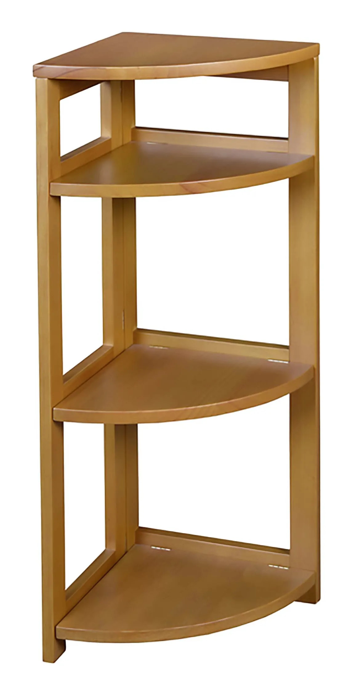 • Space-saving 4-shelf corner bookshelf including a fixed top for tight spaces