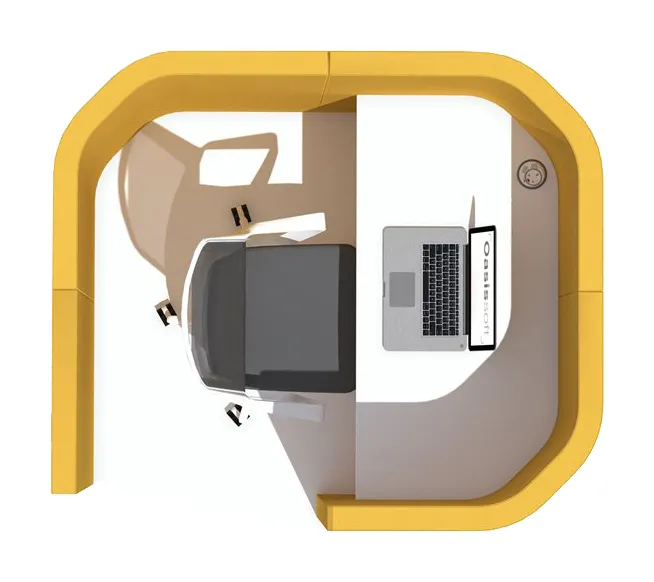 This office hub offers a compact yet functional workspace with a durable laminate surface, acoustic fabric panels, and curved edges designed for comfort and focus. Built for efficiency, it features leveling glides, left- or right-hand openings, and assembles in about an hour with two people. The booth's material construction is protected by a 12-year manufacturer's warranty.