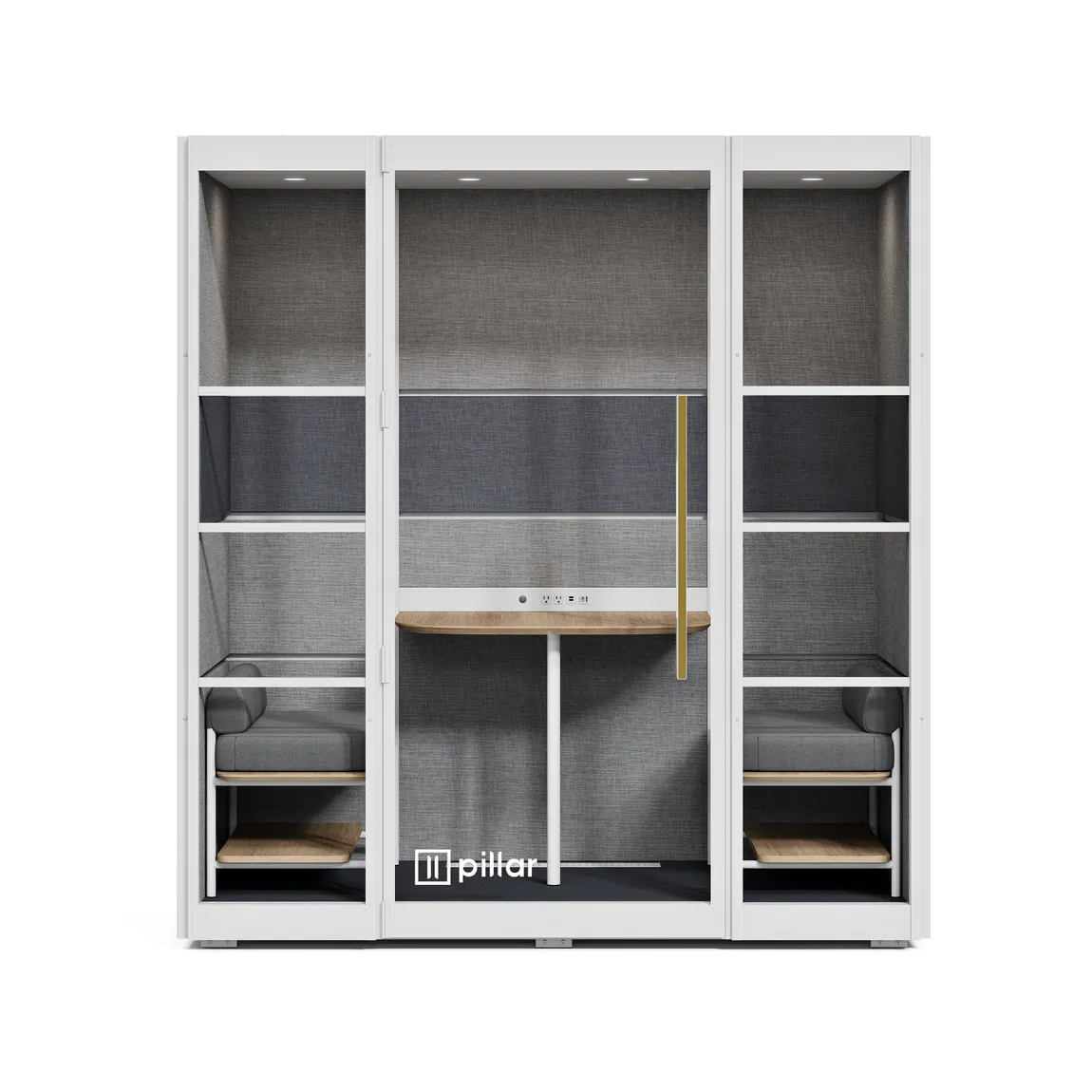 This soundproof office pod creates a complete enclosed meeting space for two, combining a soundproof booth with integrated LED lighting, active ventilation, and a central table flanked by two cushioned seats for efficient collaboration. Supported by a steel frame and acoustic panels made from recycled materials, it installs quickly and is backed by a 3-year limited warranty for lasting performance.